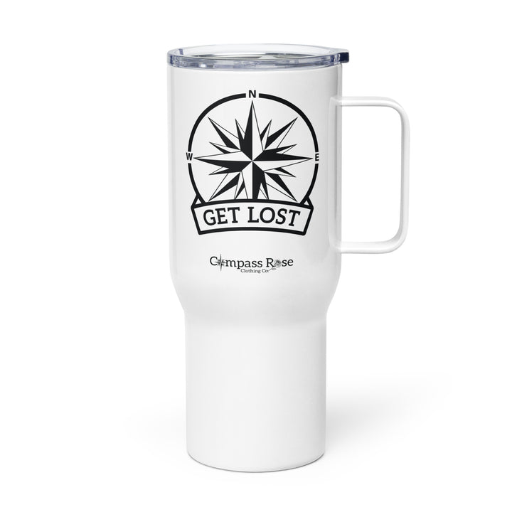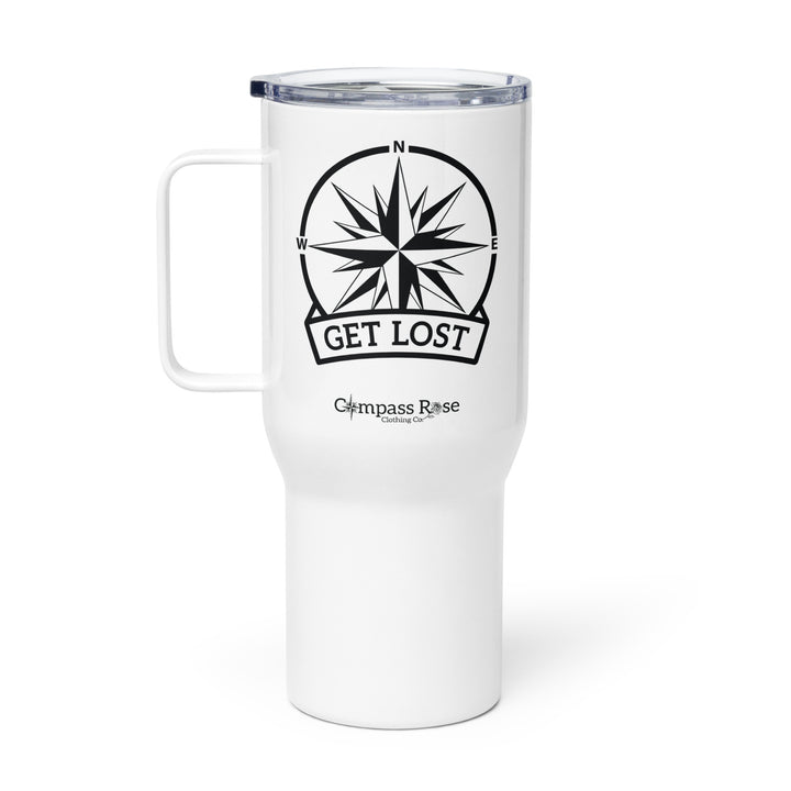 Sip in style and comfort with the "Get Lost" travel mug from Compass Rose Clothing Co.