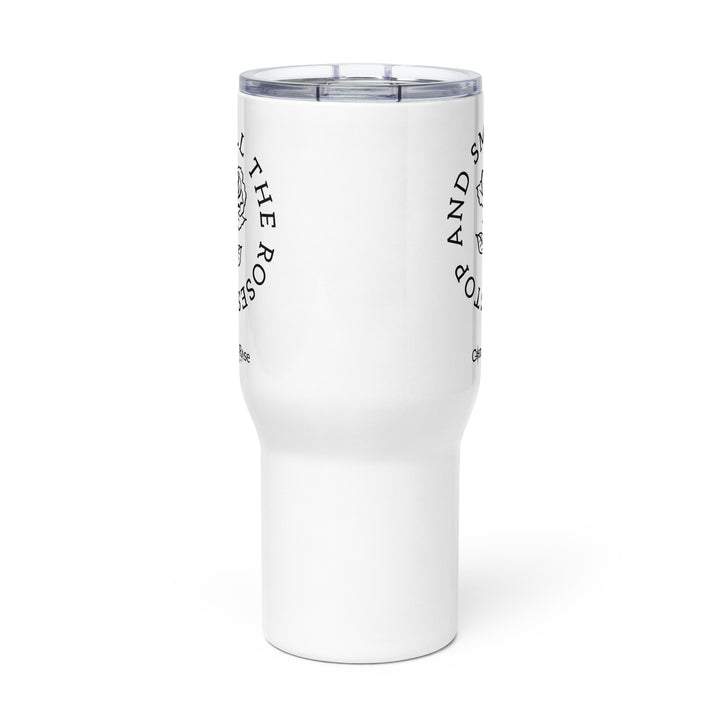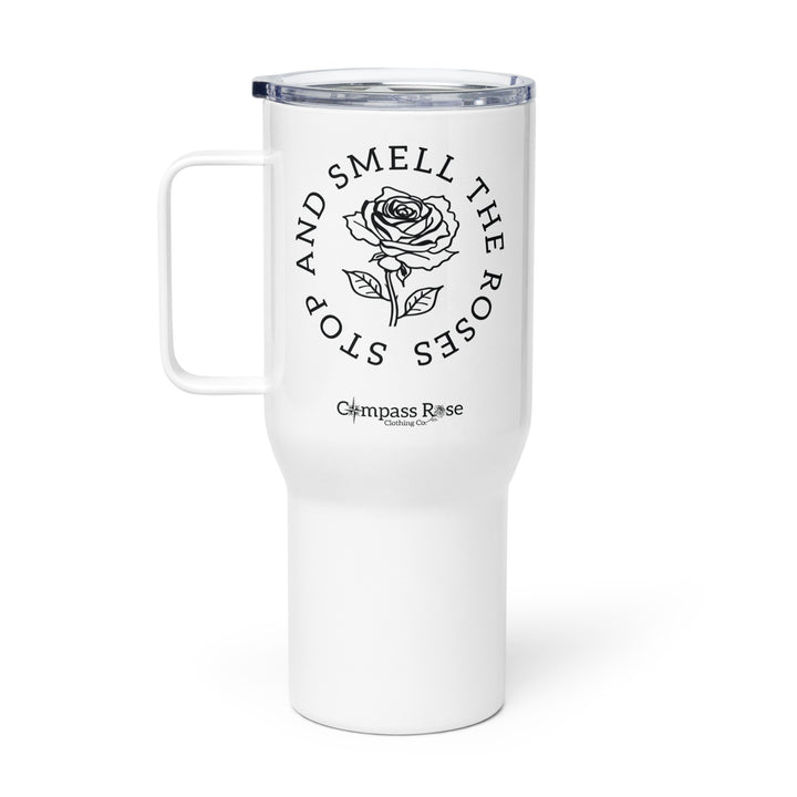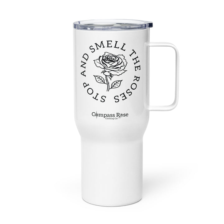 Embrace life's journey with this "Stop and Smell the Roses" Travel Mug from Compass Rose Clothing Co.